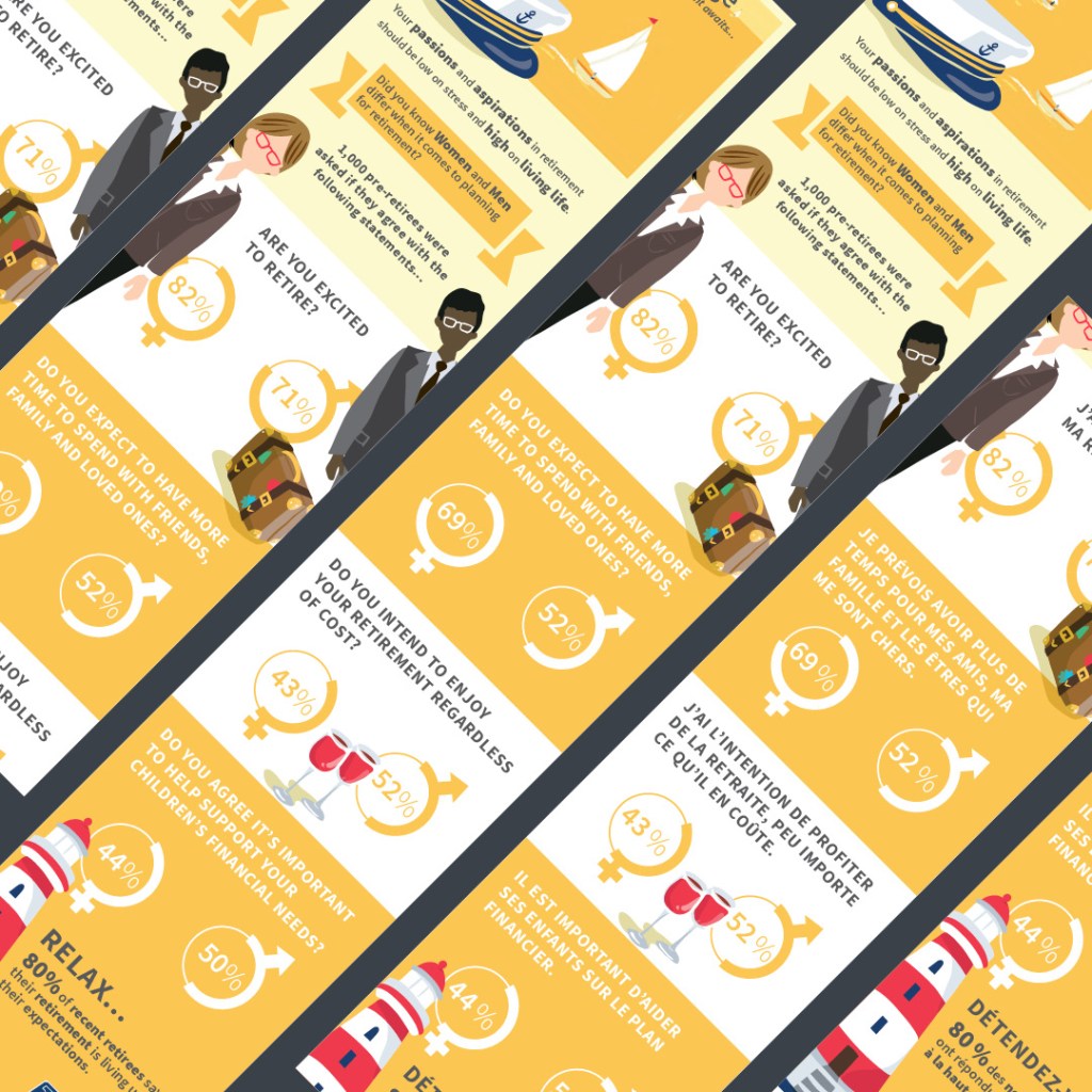 Investors Group wanted to theme their career’s landing page on the client-facing website. The challenge was to develop a potent visual metaphor to support the “grow your career” theme. Mountain climbing tools as a visual metaphor were used as icons to showcase the written content. These illustrations are a good compromise between details and simplicity. These icons need to be shown small and large. Too much detail and the artwork vibrates on the screen, and too little detail starts to look cartoony. The illustration solution was to draw shapes to build the image and not use linework to define the shape.