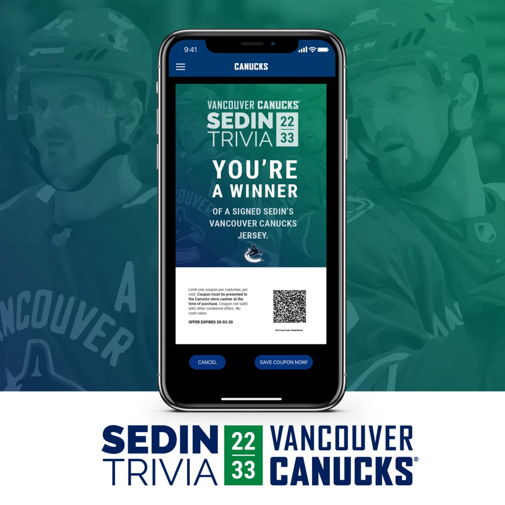 I created a trivia game for the Sedin brothers’ retirement using the Fannex gamification platform for the mobile in-venue experience.