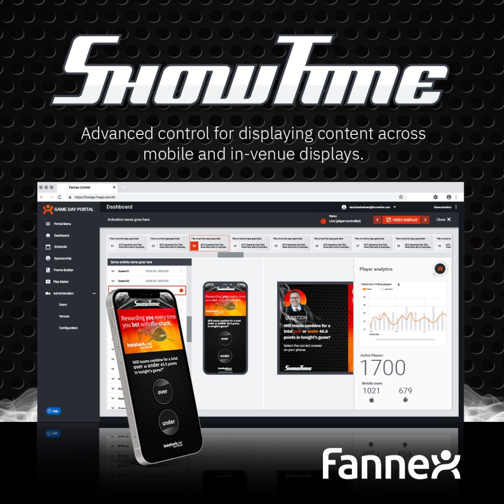 The Showtime Console user interface offers a revolutionary producer-controlled real-time interaction with the audience. Operators can simultaneously control video displays and fan mobile device screens during live events, shows and streams. During live presentations, the operator can switch an audience to view key screens across devices and in-venue videoboard. The advanced design resulted in more flexibility for more than 60 professional sports teams.